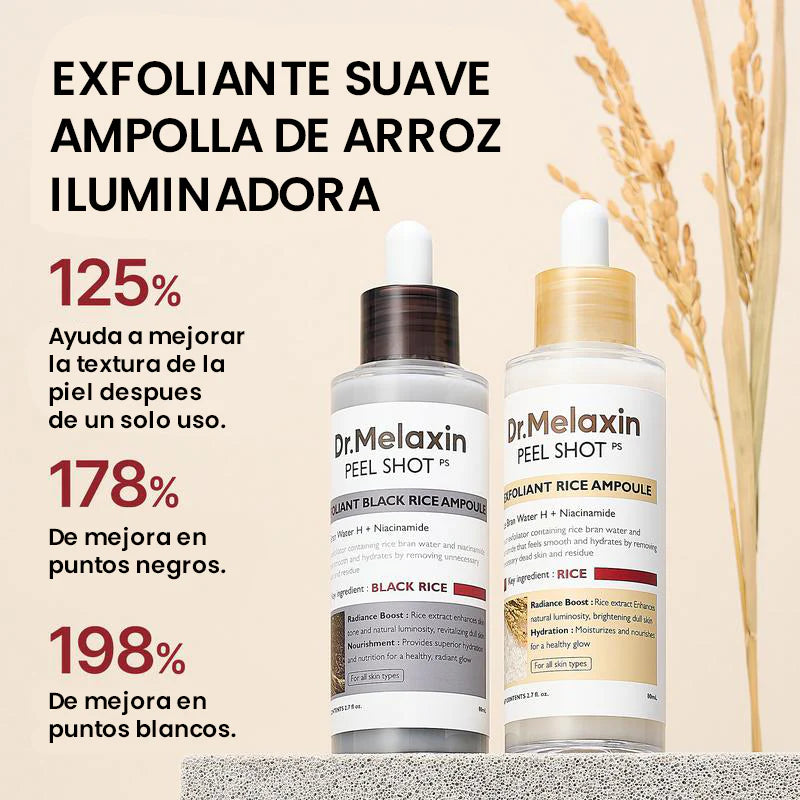Enriquecida con potentes ingredientes transformadores, Dr. Melaxin Peel Shot Glow Rice Ampolla ofrece una purificación profunda, restaura la elasticidad de los poros, suaviza la textura áspera y mejora visiblemente la claridad y el refinamiento de la piel. Disfruta de poros más pequeños, claros y con un aspecto rejuvenecido, sin irritación ni ingredientes agresivos.